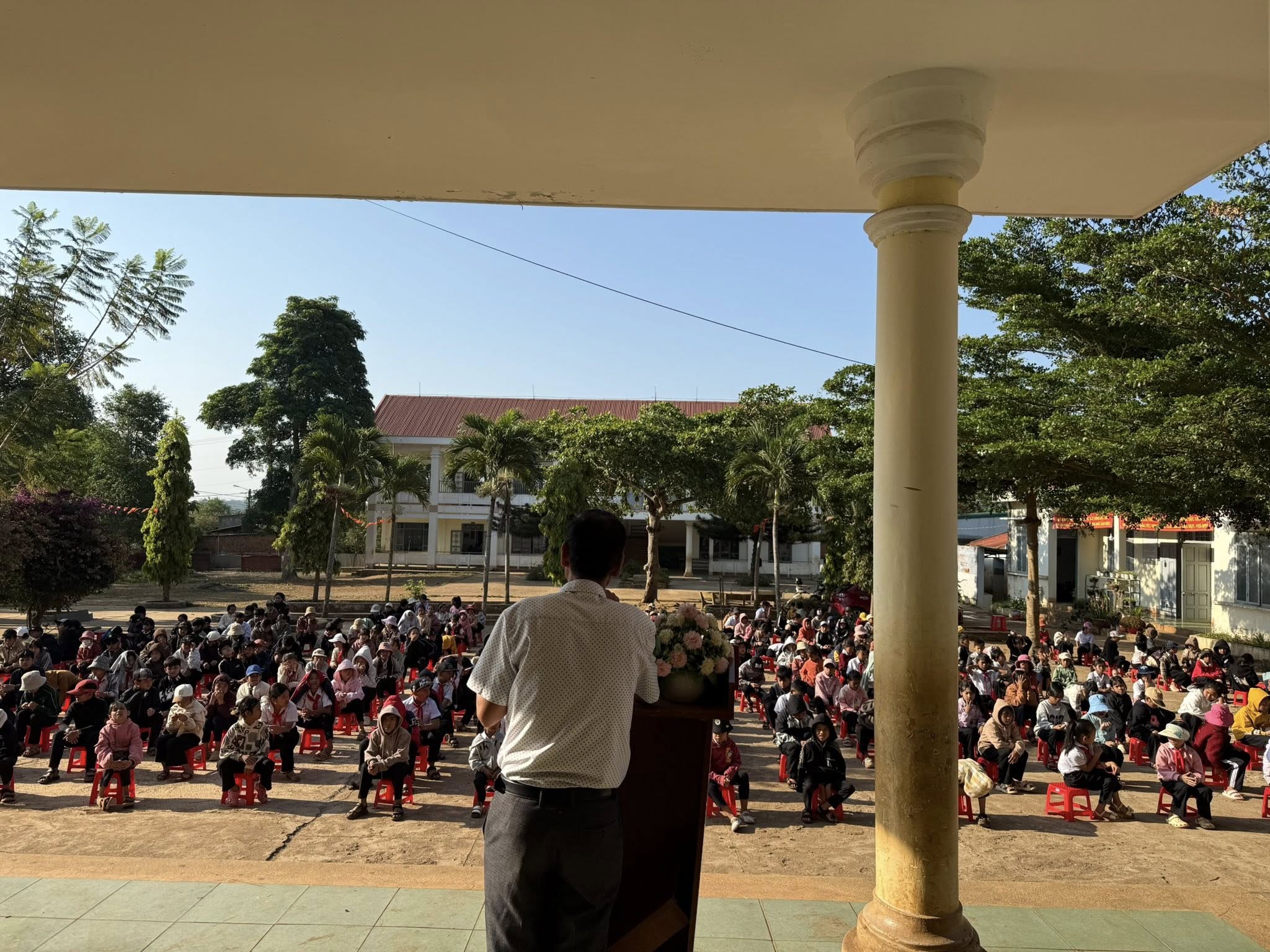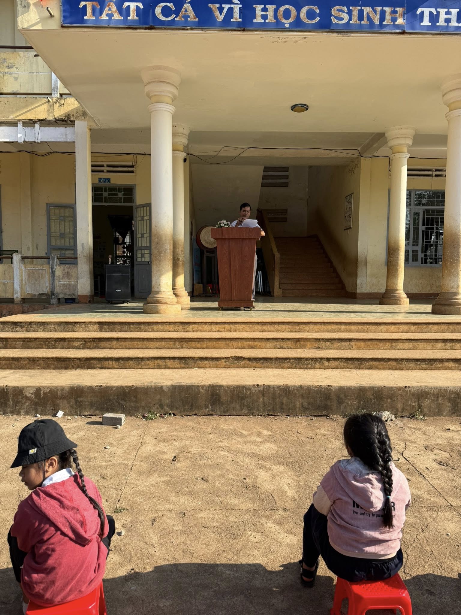 Liên đội Trường Tiểu học Ama Jhao cùng Ban Giám hiệu tổ chức chào cờ đầu tuần.