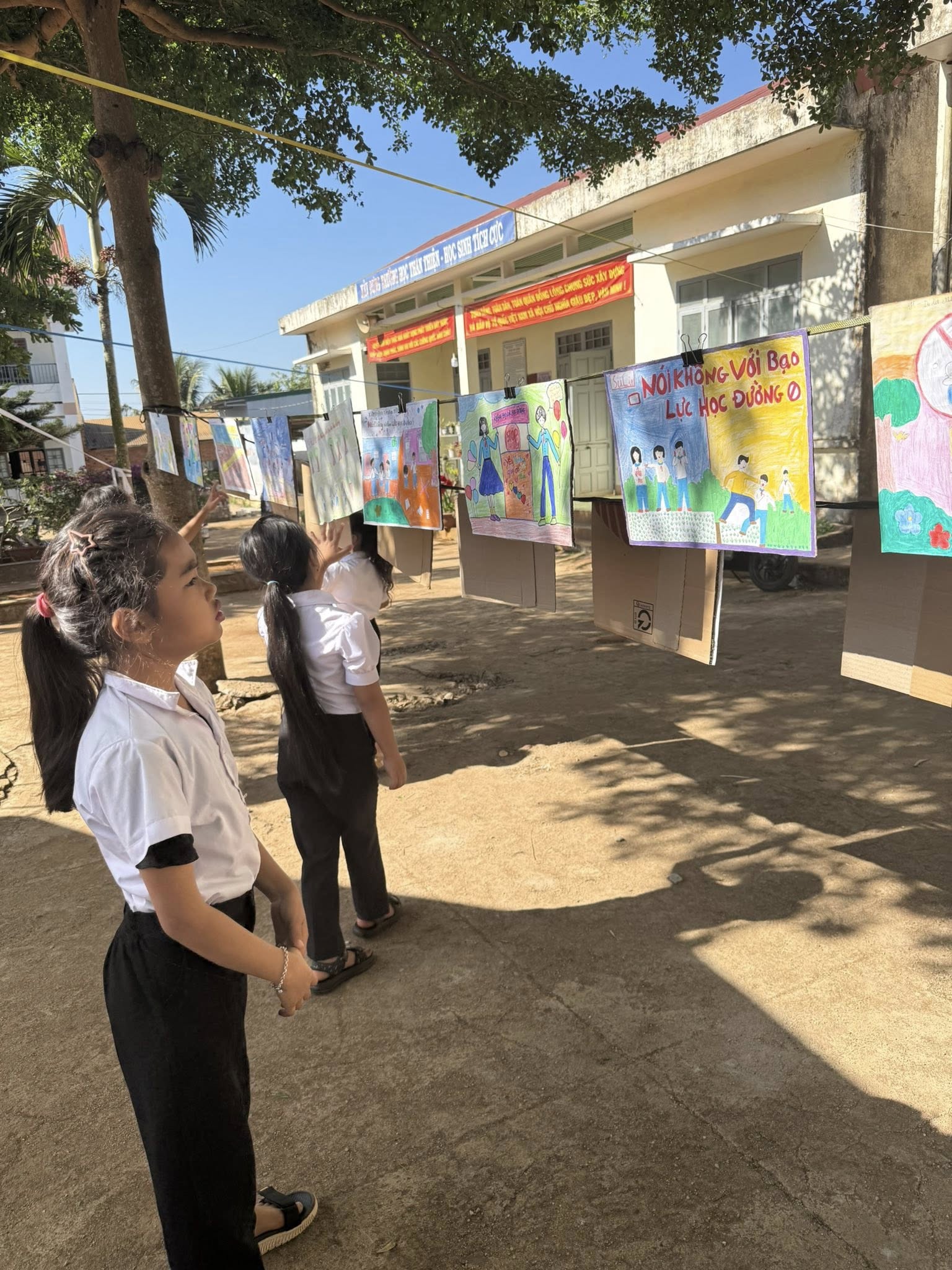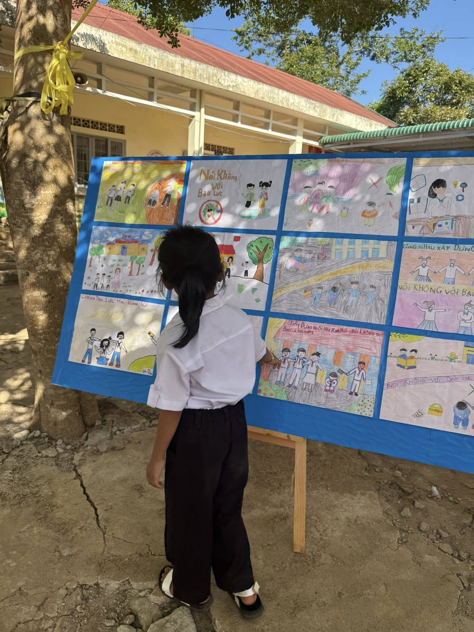 🎨 Nhiều bức tranh sáng tạo được trưng bày, đặc biệt là các tác phẩm mang ý nghĩa phòng, chống bạo lực học đường.